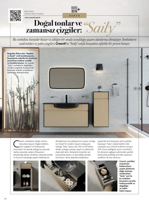 banyolara taşıyor. Doğal renklerin, ise Creavit’in modern tasarım anlayışıyla karşılayan “Saily”, yüksek kaliteli cilalı