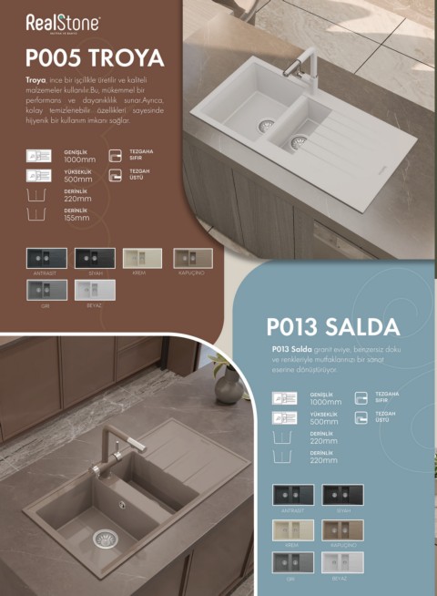 P005 TROYA Doğal granit taşının sağlamlığına dayanan eviye, yıllarca kullanabileceğiniz bir yatırım ve mutfaklarınıza değer katıyor.