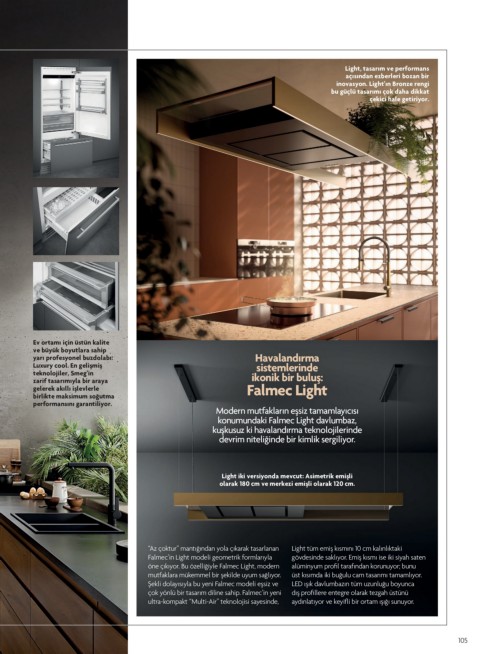 çok yönlü bir tasarım diline sahip. Falmec’in yeni dış profillere entegre olarak tezgah üstünü