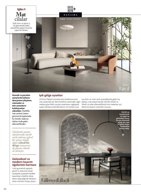 minimalist ve mat yüzeyinde yer alan kristalimsi yansımalar, ışığın dokulu, mat yüzeyli karolar; 60x120, 60x60 ve